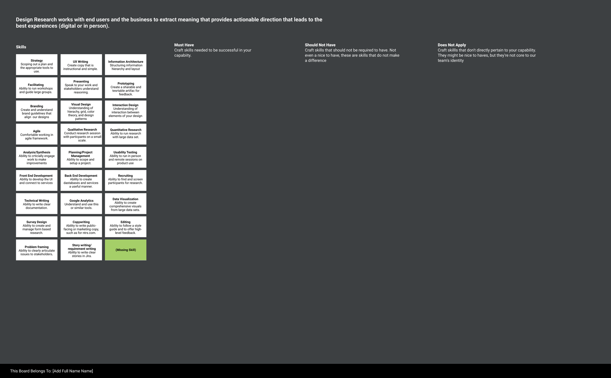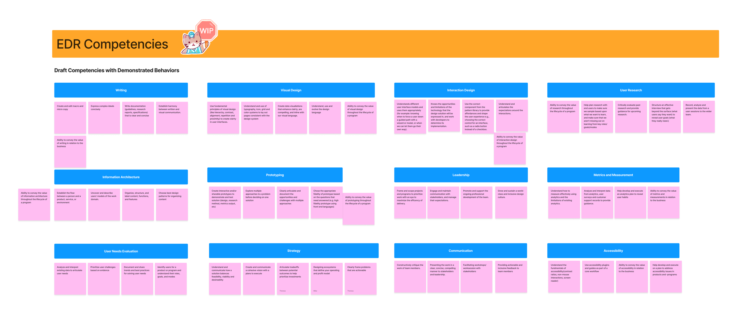 Going back to the artifacts I had created with the teams in Figma, I worked with the senior leadership team to get us down to a refined set of competencies that is a reflection of where our team currently stands and aspirational for where we want to go in to the future.