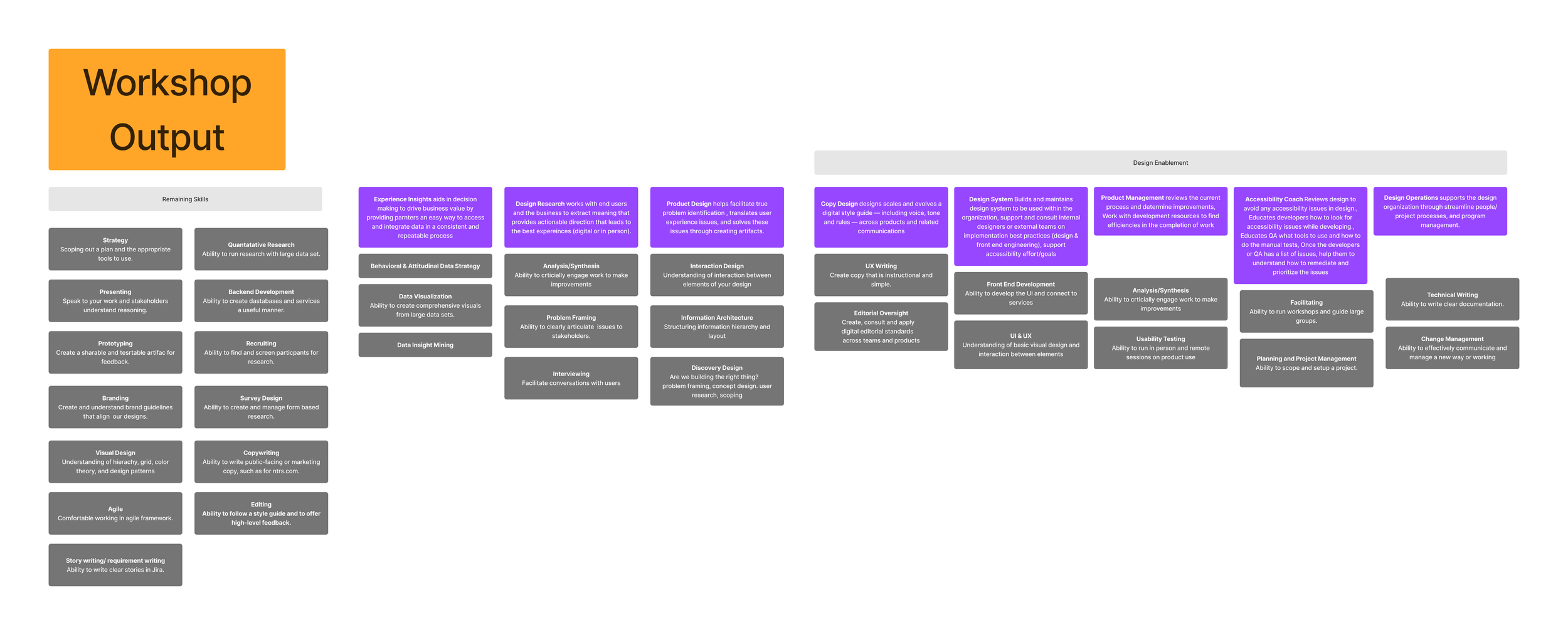 I worked with each specific capability in Experience Design and Research–product design, design research experience insights (metrics) and design enablement. I led them through a series of exercises design to get each specific capability aligned around a rank ordered list of the top 3 competencies.