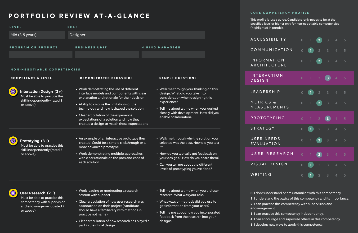 To help our team build a more balanced organization, we leveraged the core competencies to see where we were over and under indexed in skills on specific embedded teams and created an interview guide.