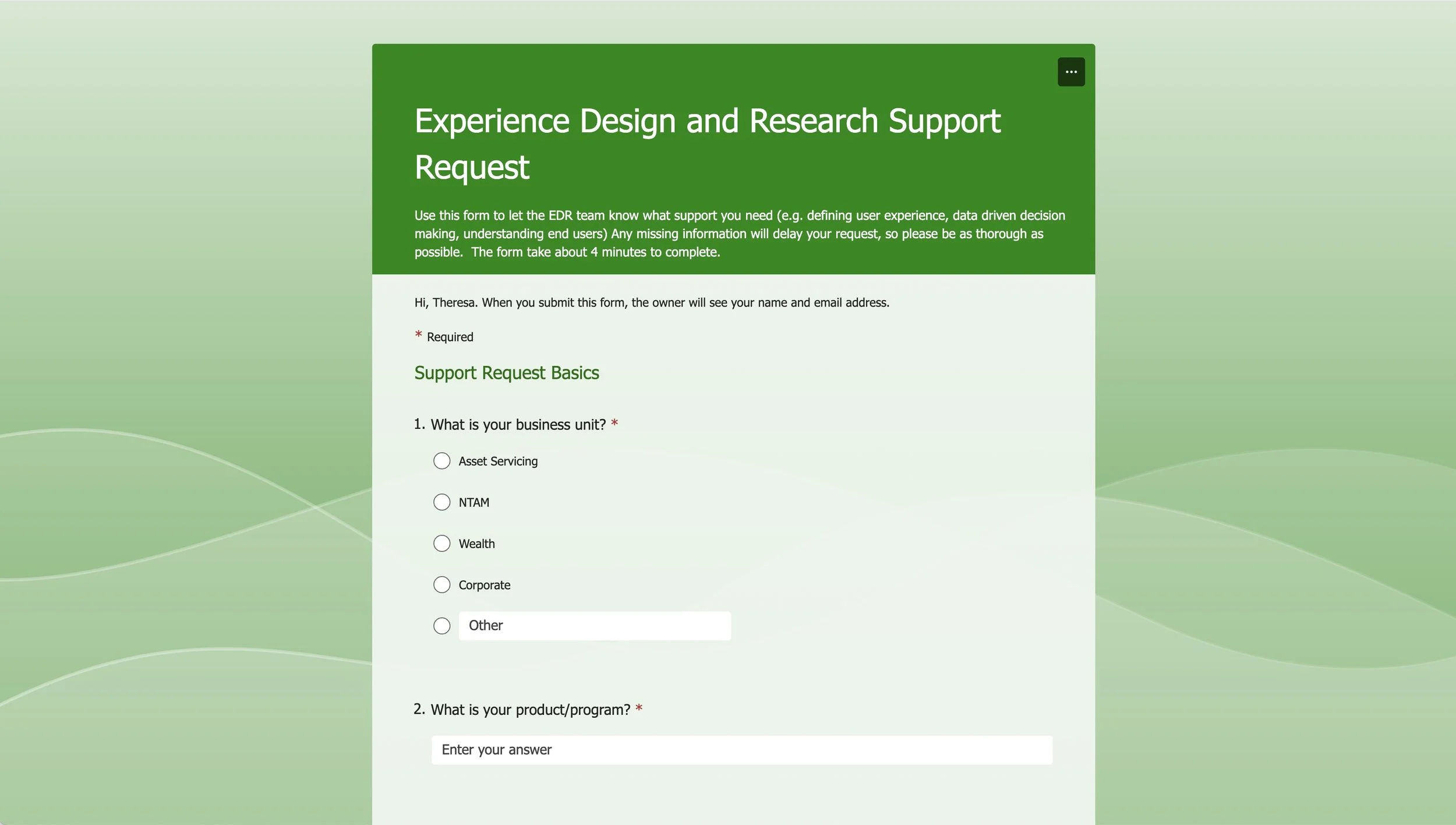 Working with our design leadership team, I created and launched a Microsoft form to help gather the support requests. The form, which could be filled out by the individuals making the request or anyone in the design organization who received a request, created an item in Microsoft list, which was reviewed on a weekly basis.