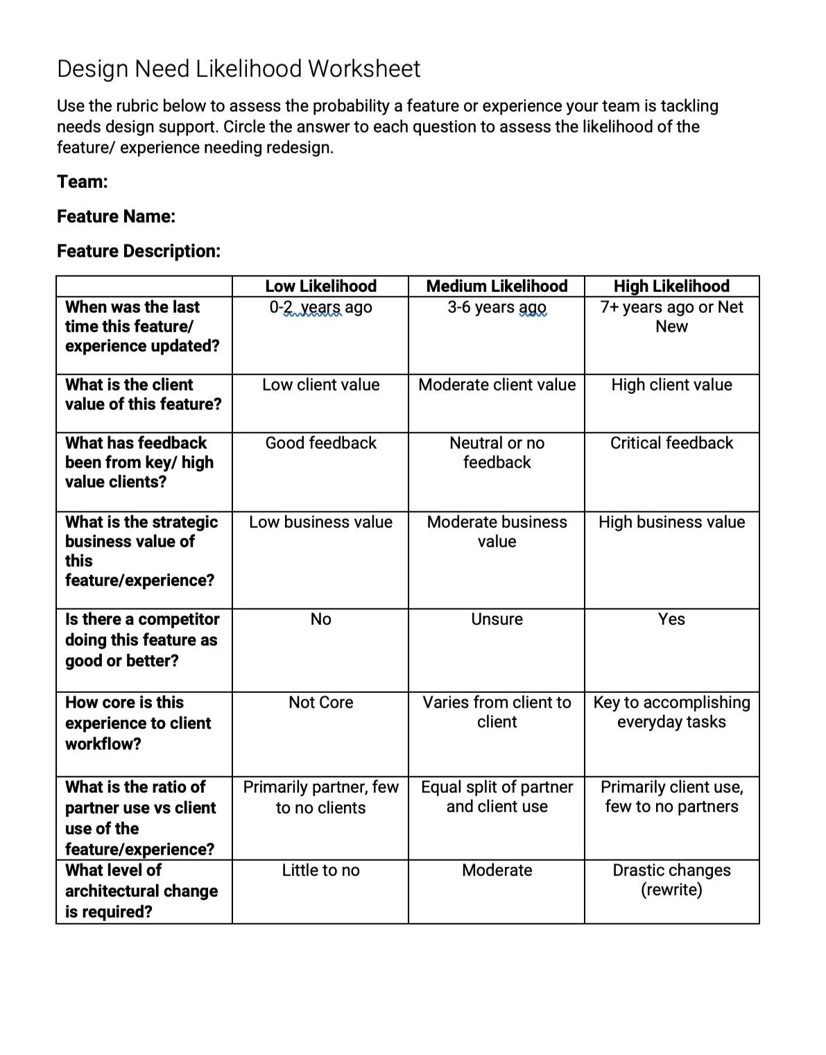 Design Risk is based on a rubric I developed in 2020 to help an agile team ,where I was the Design Program Lead, with PI Planning. It asks a series of questions to help determine the likelihood and scope of the support you’d need from the design organization by asking about: